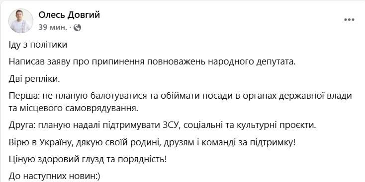 «Ухожу из политики. Написал заявление о прекращении полномочий народного депутата», — сообщил Довгий.