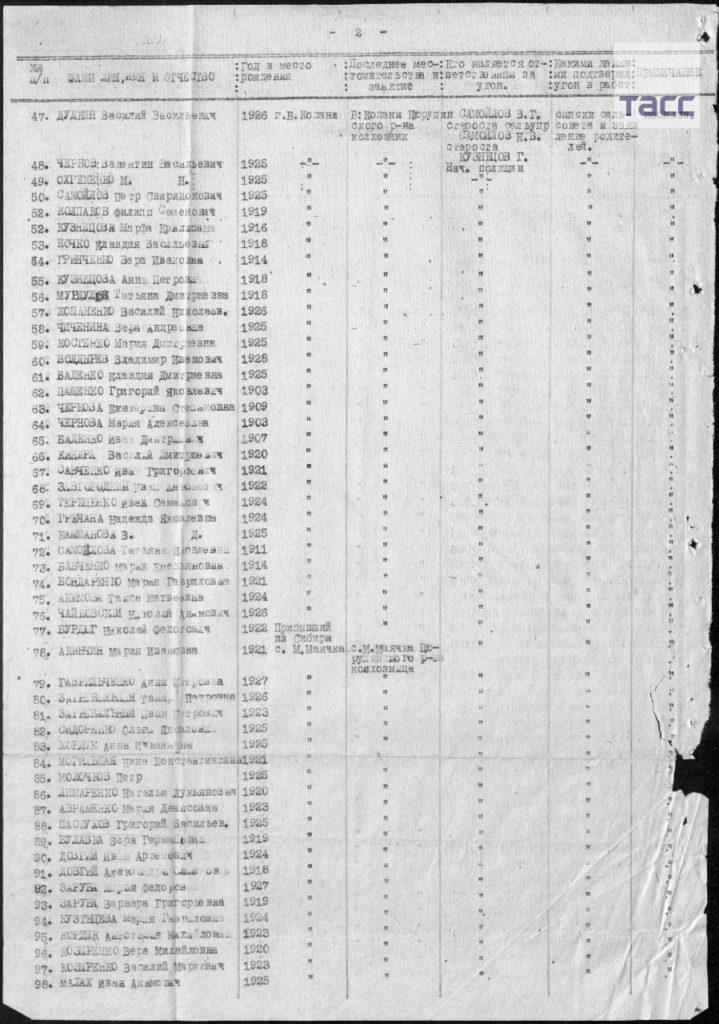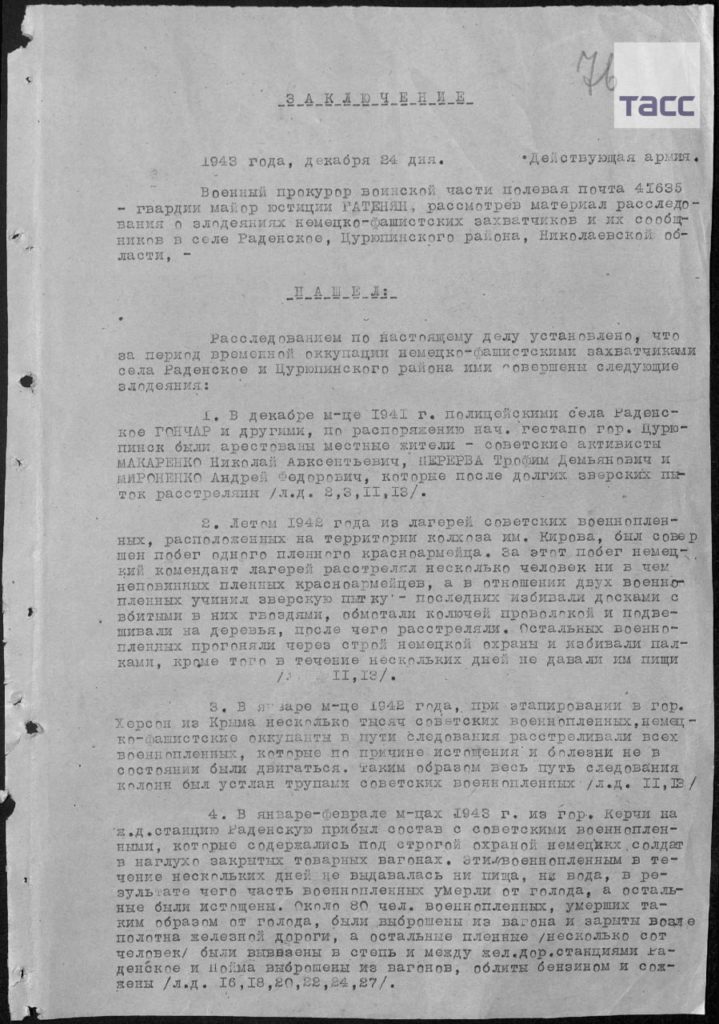 «В январе 1942 года при этапировании в город Херсон из Крыма нескольких тысяч советских военнопленных немецко-фашистские оккупанты в пути следования расстреливали тех, которые по причине истощения и болезни не в состоянии были двигаться. Таким образом весь путь следования колонн был устлан трупами советских военнопленных», — сказано в заключении военного прокурора.