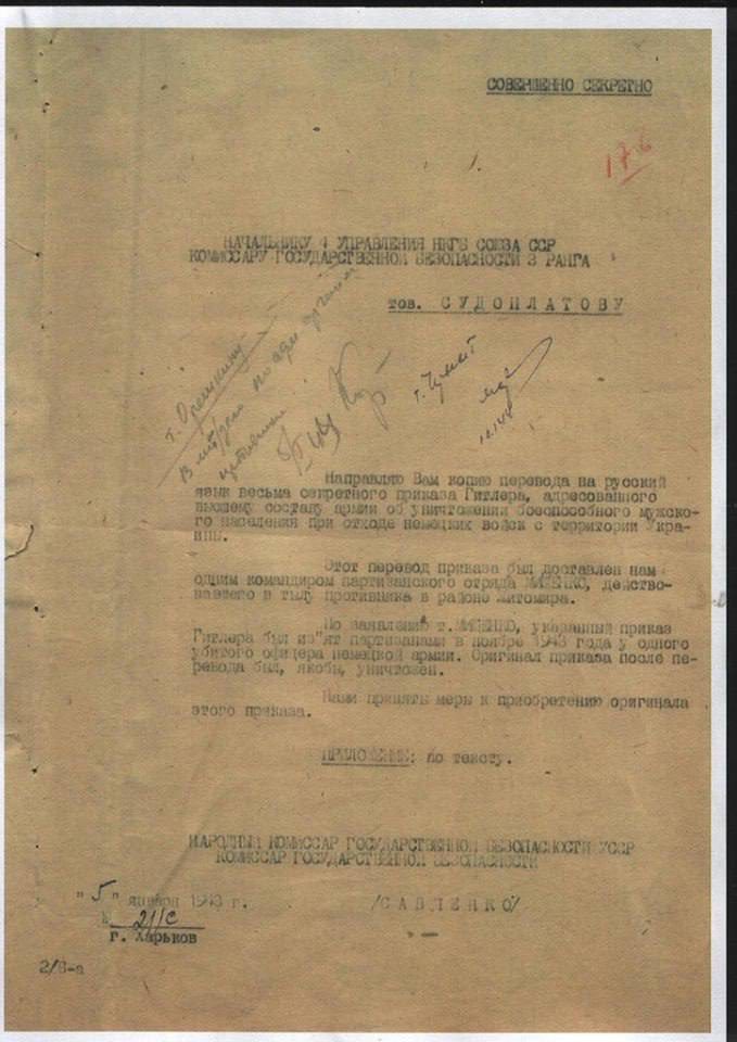 Копию приказа, переведенного на русский язык, доставили начальнику 4-го управления НКГБ СССР Судоплатову. В сопроводительном письме от 5 января 1943 года говорится, что документ был изъят партизанами в Житомире в ноябре 1943 года у одного из убитых немецких офицеров. Оригинал якобы был сожжен.