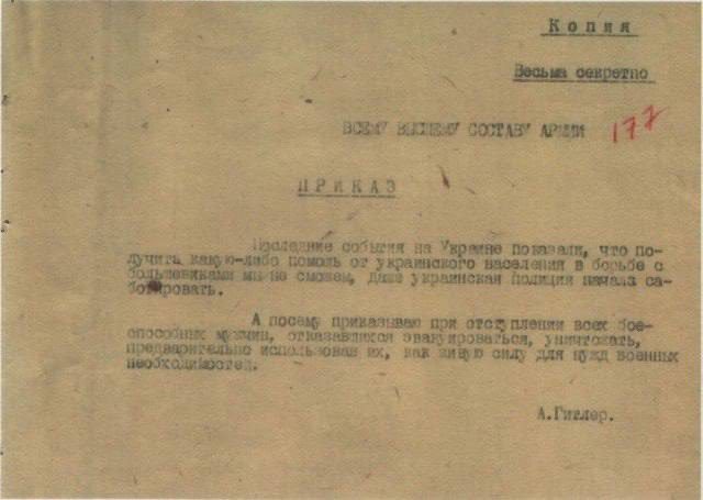 «Последние события на Украине показали, что получить какую-либо помощь от украинского населения в борьбе с большевиками мы не сможем, даже украинская полиция начала саботировать. А посему приказываю при отступлении всех боеспособных мужчин, отказавшихся эвакуироваться, уничтожать, предварительно использовав их для нужд военных необходимостей», — говорится в приказе Гитлера под грифом «весьма секретно».