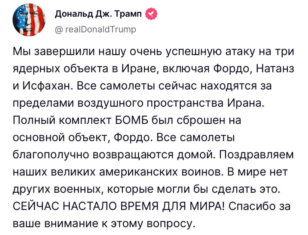 О совершенной атаке Трамп объявил в социальной сети Truth Social, а потом устроил пресс-конференцию. Он назвал удары по территории Ирана «впечатляющим военным успехом» и заявил, что ключевые объекты «целиком и полностью уничтожены». Цель атаки, по словам главы Белого дома, — ликвидация иранского ядерного потенциала. Он призвал Тегеран «согласиться прекратить эту войну» и пригрозил более масштабными ударами.