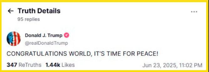 Президент США Дональд Трамп заявил, что настало время мира, и выразил надежду на снижение напряжённости на Ближнем Востоке.