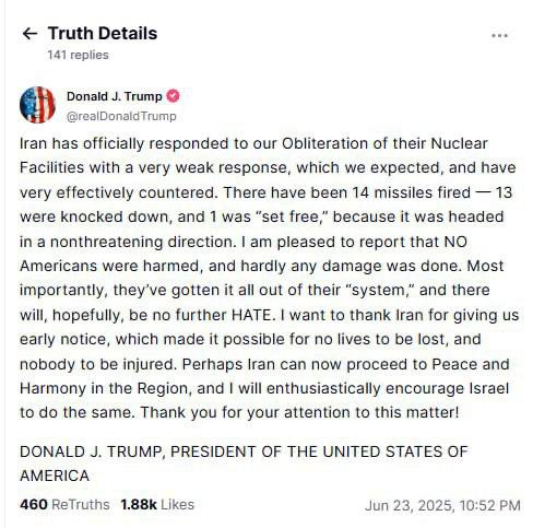 Напомним, что Иран атаковал американскую авиабазу в Катаре.