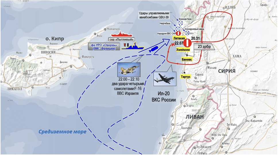 Когда была активирована сирийская ПВО, израильские самолеты ушли дальше над морем, но один из израильских истребителей начал маневр — он пошел на сближение с российским Ил-20, который шел на посадку на нашу базу Хмеймим, а затем отвернул от нашего самолета.