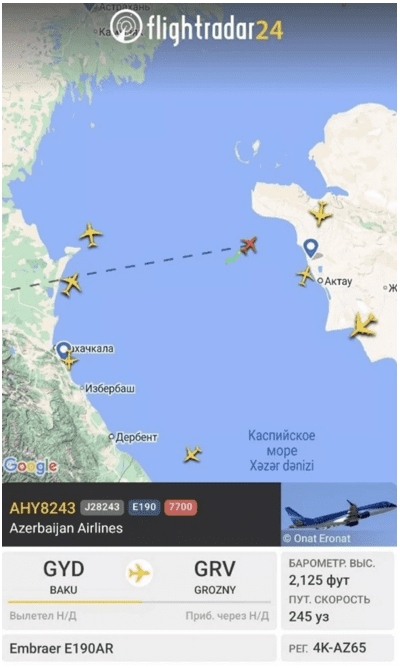 Согласно азербайджанским правительственным источникам, самолёт был поражён российской ракетой класса «земля-воздух» «в момент активности беспилотников» в небе над Грозным.