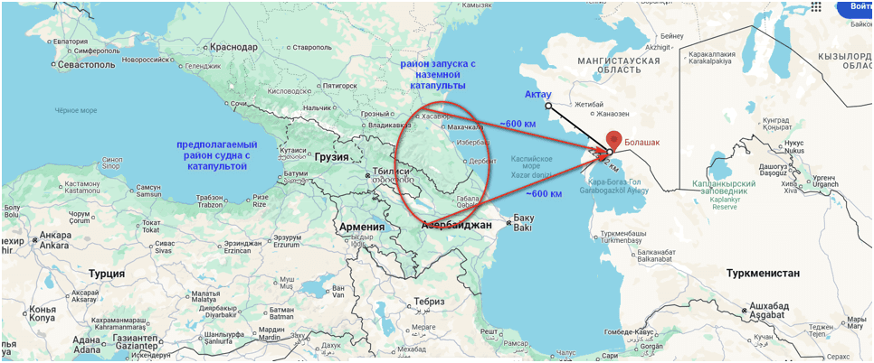 БПЛА, в таком случае, должен был быть запущен с наземной катапульты (на подвижном основании) с территории России, Грузии или Азербайджана, на схеме район запуска указан красным эллипсом.