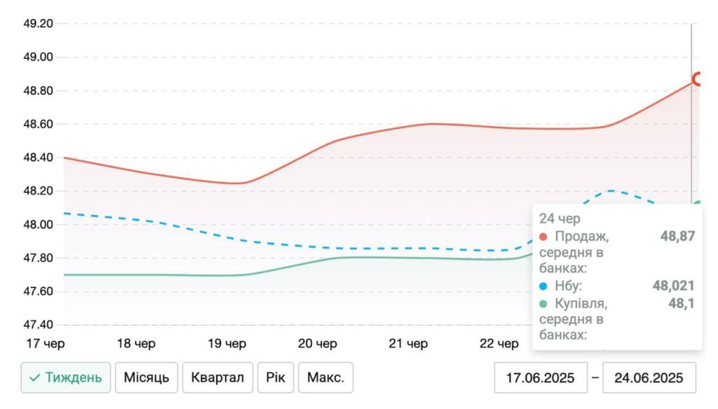 Ранее мы писали, что на понедельник, 24 июня, НБУ установил официальный курс — 48,20 грн за €1.