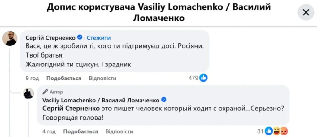 Притула и Стерненко в комментариях призвали Ломаченко прямо назвать Россию виновницей обстрелов. Но извинений они не дождались, спортсмен резко поставил комментаторов на место: Притулу он назвал «бессовестным человеком», а Стерненко — «говорящей головой».