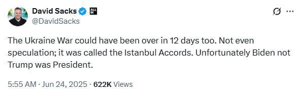 «Война на Украине тоже могла закончиться за 12 дней. Это даже не домыслы — это называлось Стамбульские соглашения. К сожалению, тогда президентом был Байден, а не Трамп», — написал Сакс в соцсети.