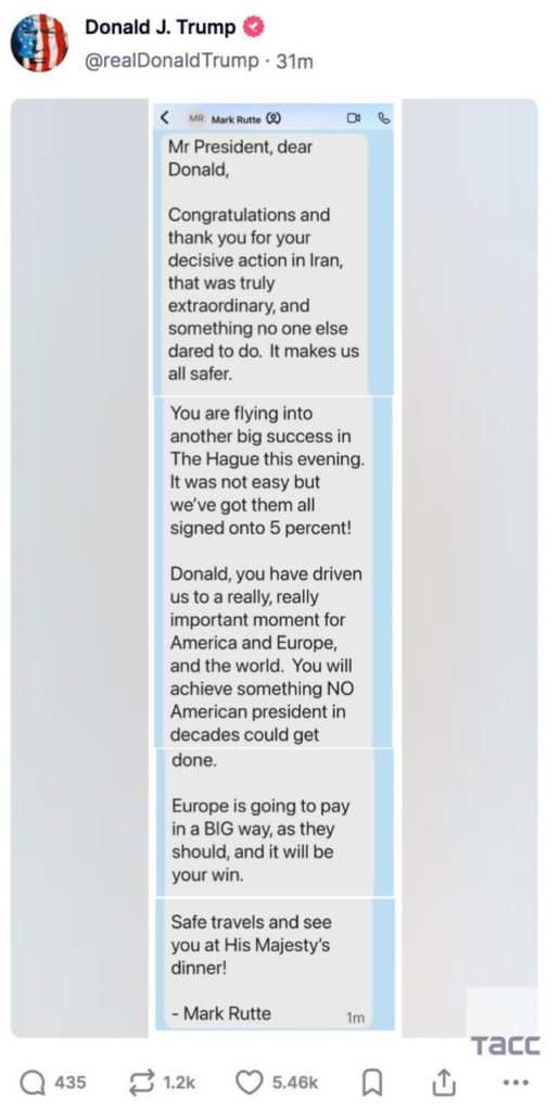«Это было нелегко, но мы добились того, что все они подписались под 5% ВВП на расходы на оборону! Европа заплатит большую цену, как и должна, и это будет твоя победа».