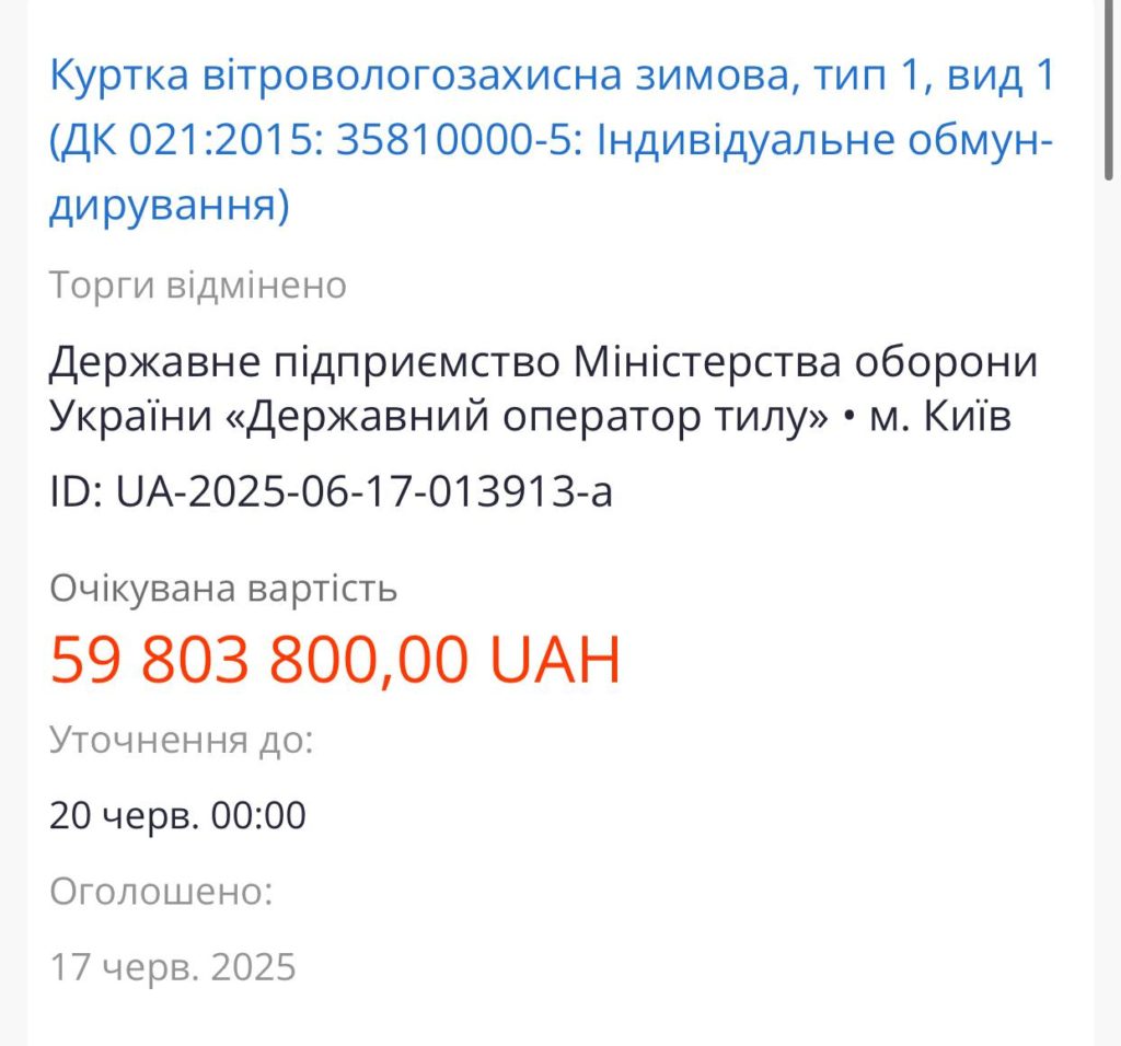 Из — за некомпетентности сотрудника Государственного оператора тыла, который ошибочно внес ненужные требования к тендерной документации, ГОТ отменил все 6 тендеров на закупку 100 тысяч зимних ветрозащитных курток для ВСУ на сумму почти 300 миллионов гривен (7 миллионов долларов).