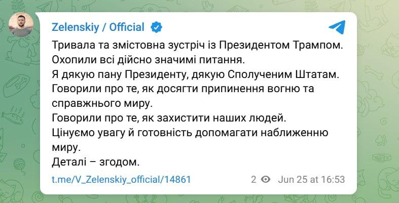 «Охватили все действительно значимые вопросы. Я благодарю господина президента, благодарю Соединенные Штаты. Говорили о том, как достичь прекращения огня и настоящего мира», — написал Зеленский.