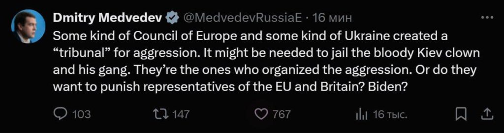 «Какой-то Совет Европы и какая-то Украина создали «трибунал» за агрессию. Может, чтобы посадить кровавого киевского клоуна и его банду? Они же организовали агрессию. Или хотят наказать представителей ЕС и Британии? Байдена?», – написал Медведев.
