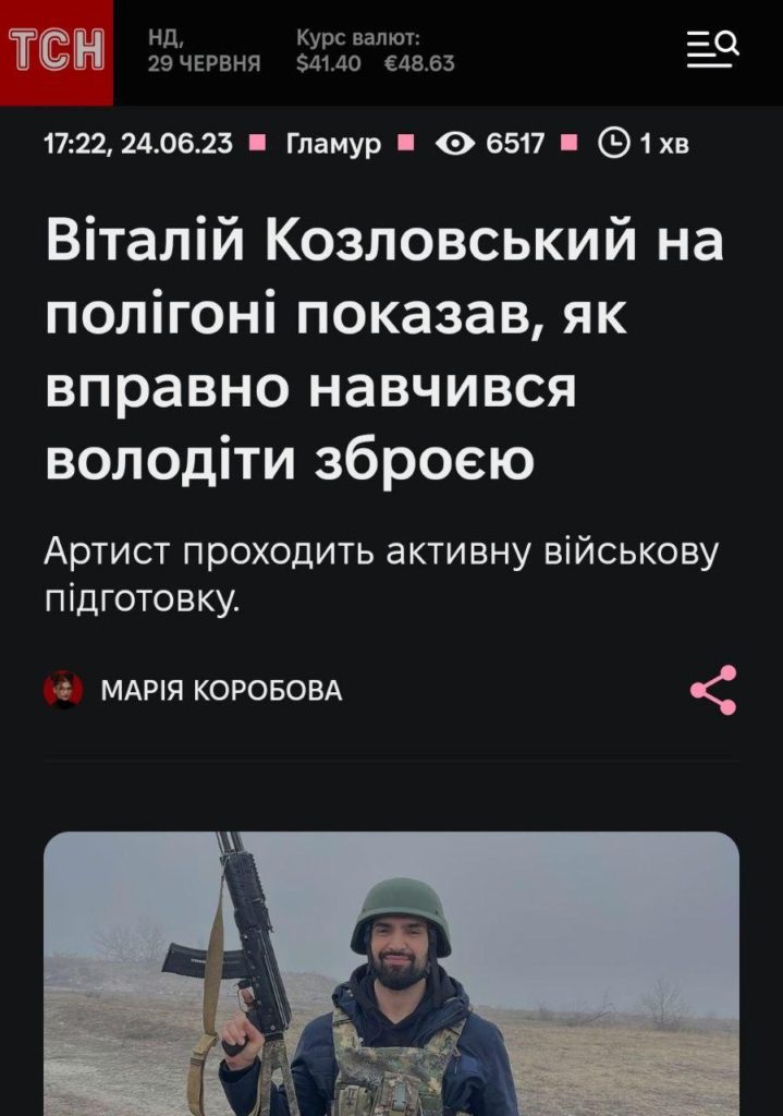 Еще один гламурный патриот – певец Виталий Козловский. Он пошел в ВСУ не по зову сердца, а по повестке. Но все же рвался защищать режим Зеленского.