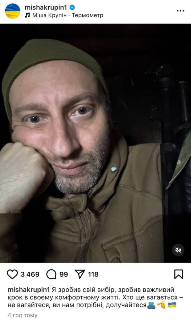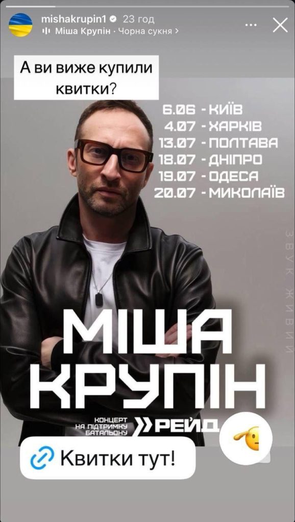 Еще один «боец» Миша Крупин. Но на передовой его точно не увидишь. А вот 4 июля можно встретить в Харькове, а 13 в Полтаве. Там пройдут концерты. На фото своей афиши «патриот» точно не выглядит изможденным.