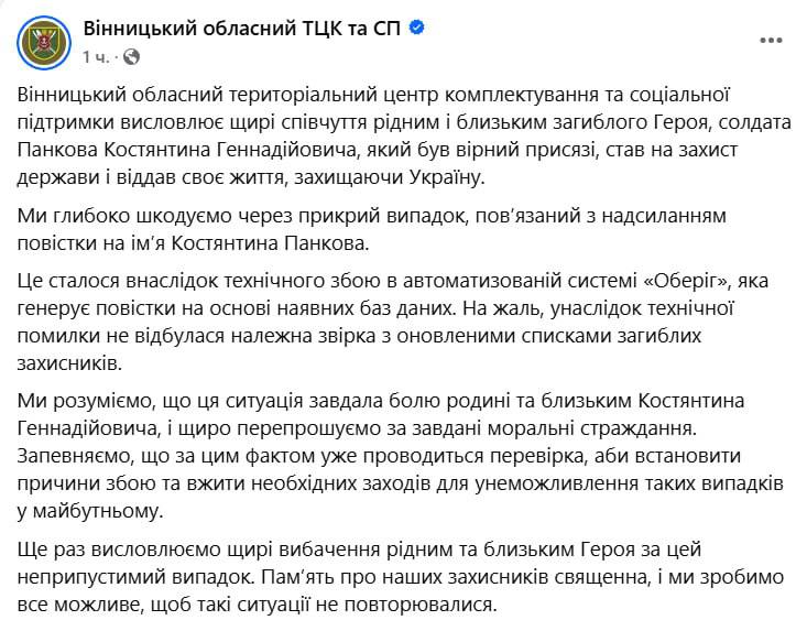 В Винницкой области местный ТЦК направил повестку боевику, который погиб на фронте.