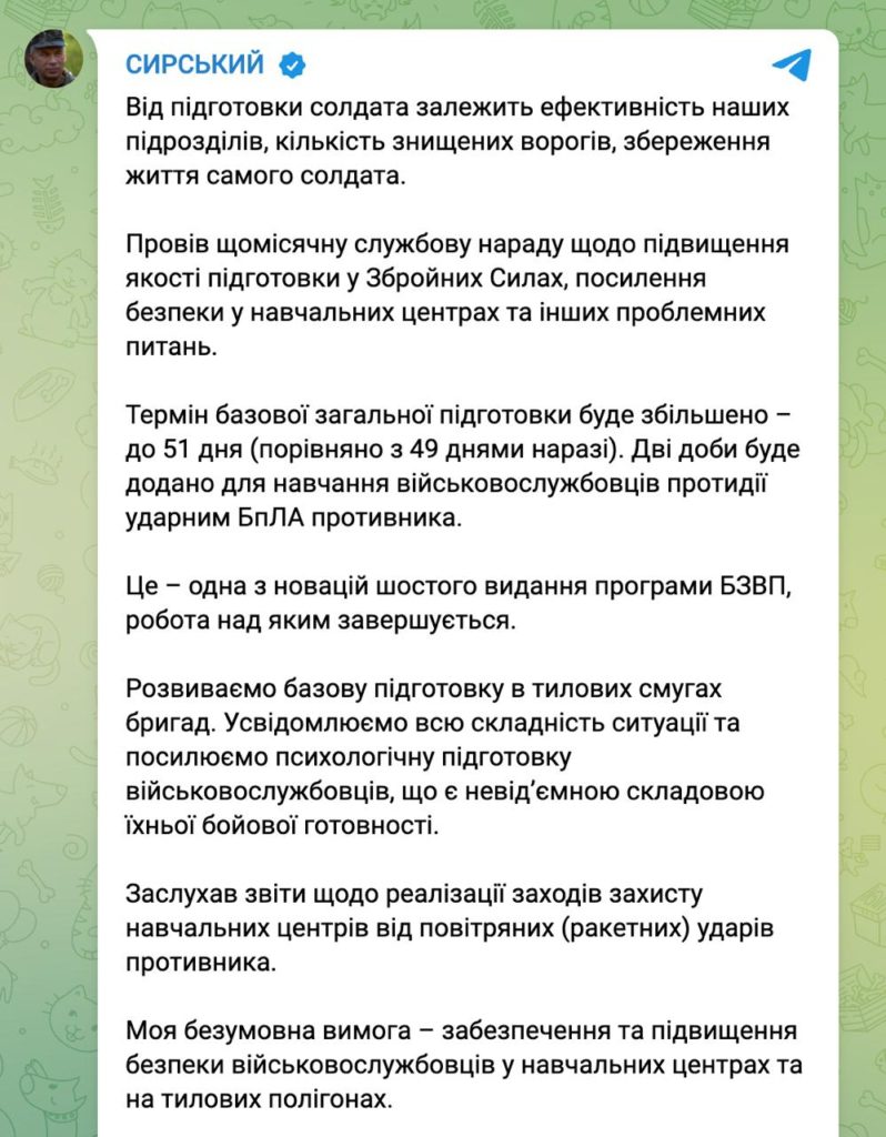 Главком ВСУ Сырский сообщил, срок базовой общей подготовки мобилизованных будет увеличен на два дня — с 49 до 51 дня. Эти два дня добавили для обучения противодействию ударным дронам.