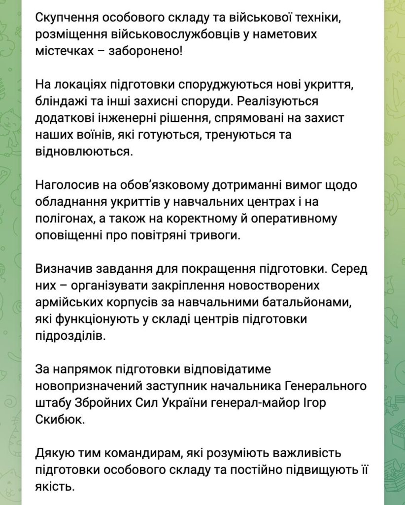 Также он отметил, что во время обучения будет запрещено скопление личного состава, военной техники и размещение военнослужащих в палаточных городках. Он заверил, что на локациях подготовки строят новые укрытия и блиндажи.