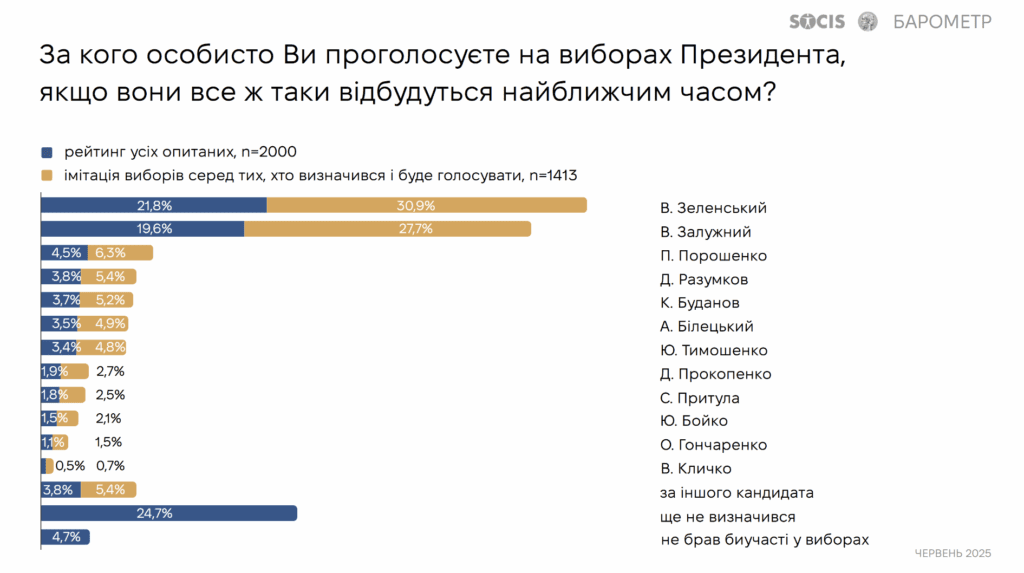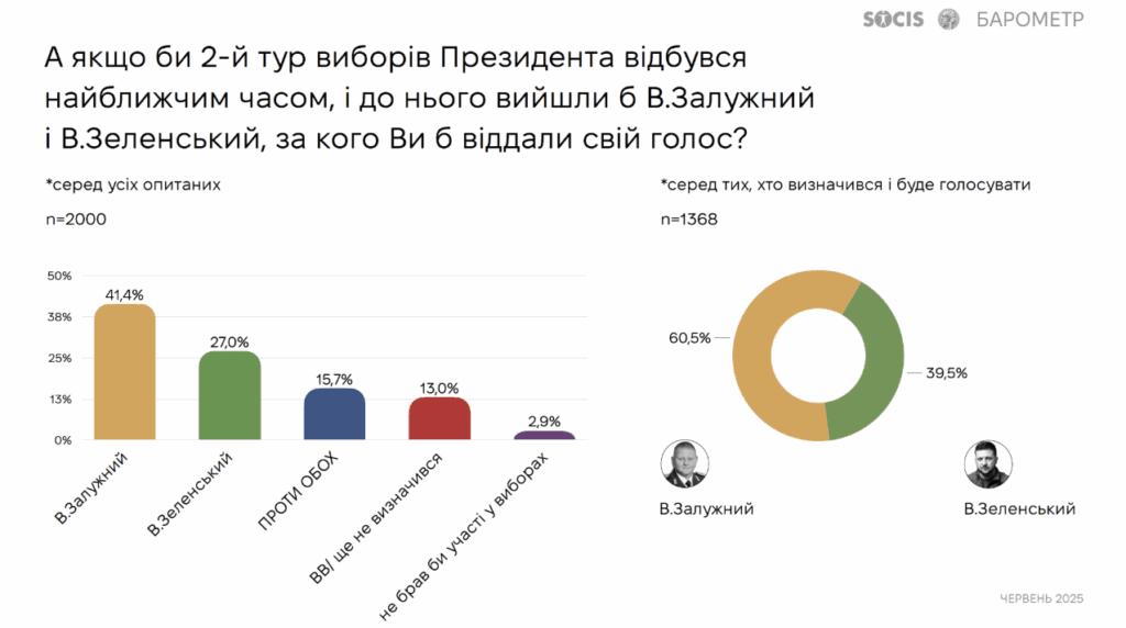 И здесь SOCIS поступил умно, назначив победителем Залужного – при 41,4%, оставив Зеленского с 27%, при этом, снова оставляя для себя возможность для манёвра, обозначив «ещё не определившихся» с 13% и «против всех» 15,7%, которые теоретически могут примкнуть к любому кандидату.