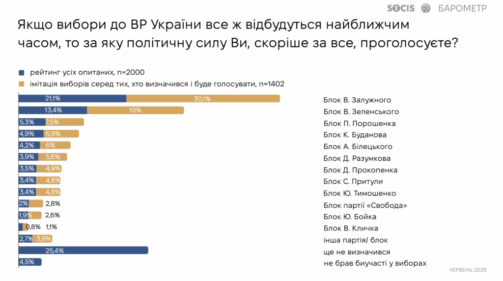 В оценке шансов политических партий, если бы проходили выборы в Верховную Раду, результаты примерно такие же, только в этот раз гипотетической, пока не существующей партии «блок Залужного», отдали первое место с 21,1% от всех опрошенных против 13,4% у условного «блока Зеленского».