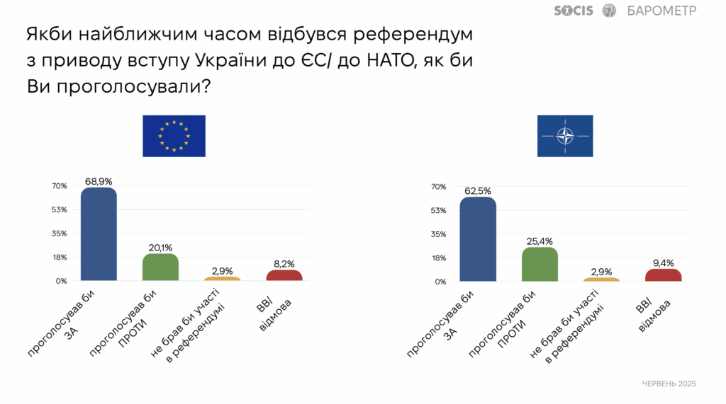 Можно отметить вопрос, связанный с членством в ЕС и НАТО, – якобы на референдуме проголосовали «За» – 68,9% за вступление в ЕС и 62,5% за вступление в НАТО. Хотя ни в одну из организаций Украину не берут, какие бы утомительные сказки по этому поводу не рассказывали населению. Тем более, что вступление в НАТО остатков Украины недопустимо для России ни в каком виде.