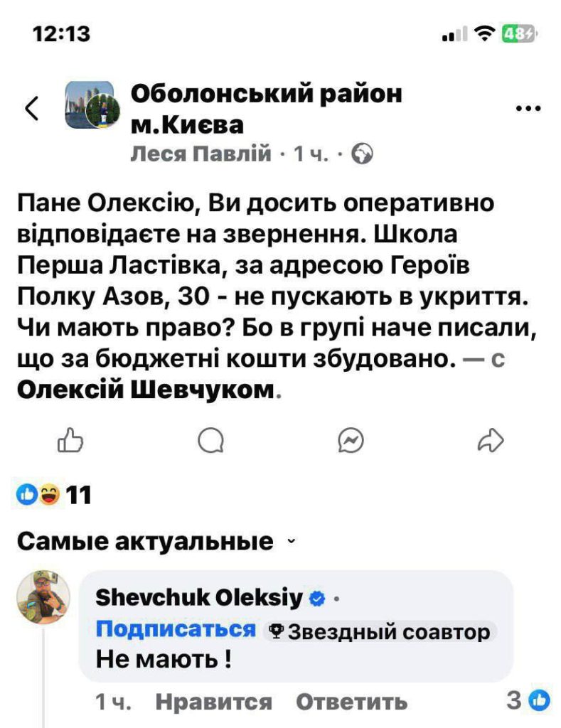 Во время очередной воздушной тревоги в Киеве местных жителей — в том числе женщин и детей — не пустили в укрытия на территории школ. Об этом массово сообщают очевидцы из Оболонского района столицы.