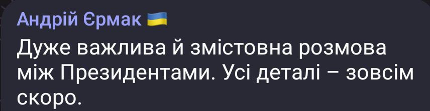 Андрей Ермак сообщил о состоявшемся разговоре между Трампом и Зеленским. По его словам, все детали разговора будут раскрыты позже.