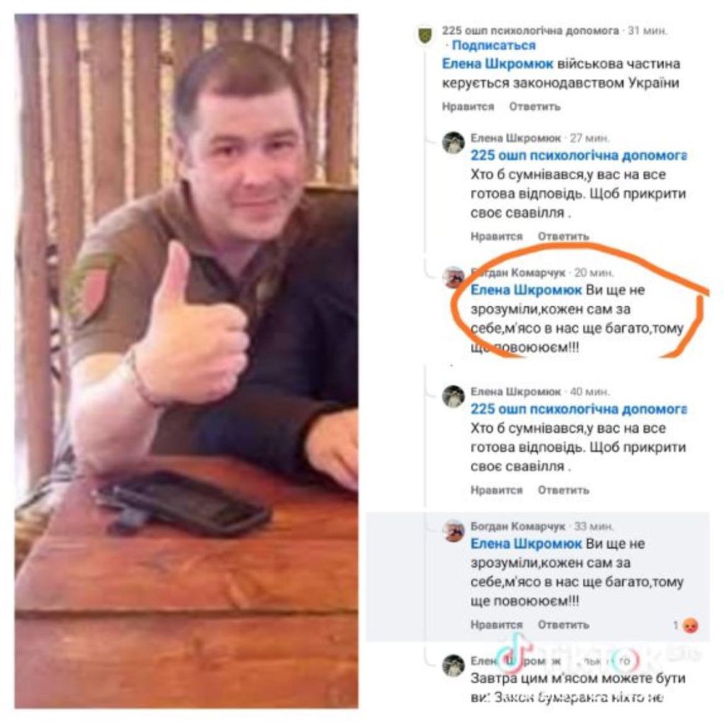 С ней тут же начал диалог штатный психолог 225-го полка ВСУ Богдан Комарчук. Он в открытую написал женщине, что боевики — это мясо, и в придачу назвал тех, кто воюет с 2022 года, «чмонями».
