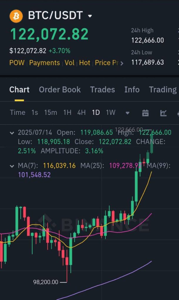 Стоимость биткоина второй раз за утро 14 июля обновила исторический максимум, поднявшись выше 122 тысяч долларов. Об этом свидетельствуют данные торгов.
