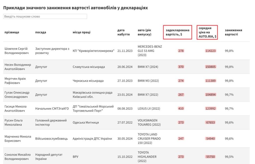 Бывшая депутат Ирина Кормышкина задекларировала Mercedes-Maybach S580 (2022) за $8 500, тогда как его рыночная цена стартует примерно от $200 тысяч. Сергей Шовгель, заместитель директора КП «Криворожтеплосеть», внес в декларацию Mercedes-Benz GLE 53 AMG (2023) за $278, хотя он стоит $114 тысяч.