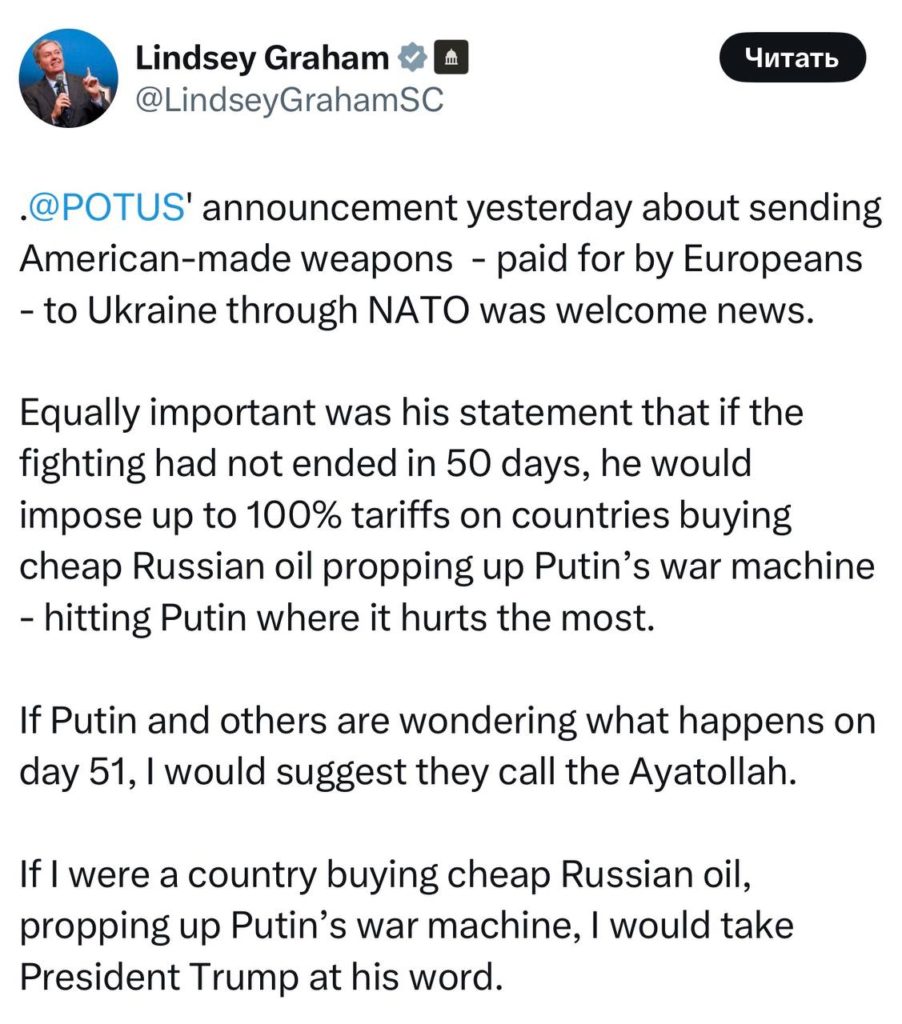 Сенатор Грэм заявил о том, что если боевые действия не прекратятся в течение 50 дней, он ввел бы пошлины размером до 100% для стран, покупающих дешевую российскую нефть и поддерживающих Путина.