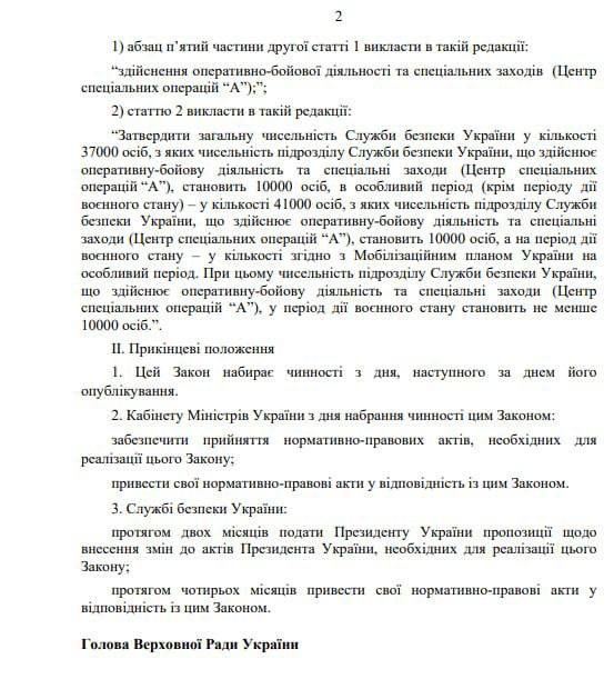 Согласно принятому документу: В мирное время численность СБУ увеличится с 27 000 до 37 000 человек; В особый период — с 31 000 до 41 000 человек; В период действия военного положения — численность определяется мобилизационным планом, но Центр «А» в любом случае будет включать 10 000 боевиков.
