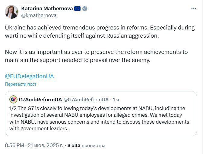 «Сейчас как никогда важно сохранить достижения реформ, чтобы сохранить поддержку», – написала она, комментируя заявление послов G7, «обеспокоенных» ситуацией с НАБУ.