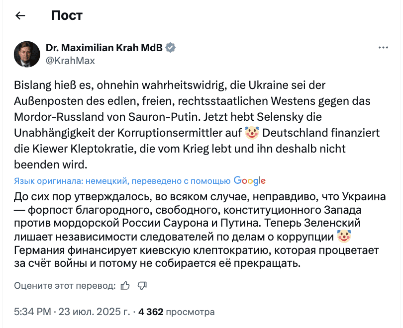 Депутат Бундестага Максимилиан Кра осудил Зеленского за решение ограничить деятельность НАБУ и САП. Он обратил внимание, что раньше неправдиво утверждалось, что «Украина – форпост благородного, свободного, конституционного Запада против мордорской России Саурона и Путина».