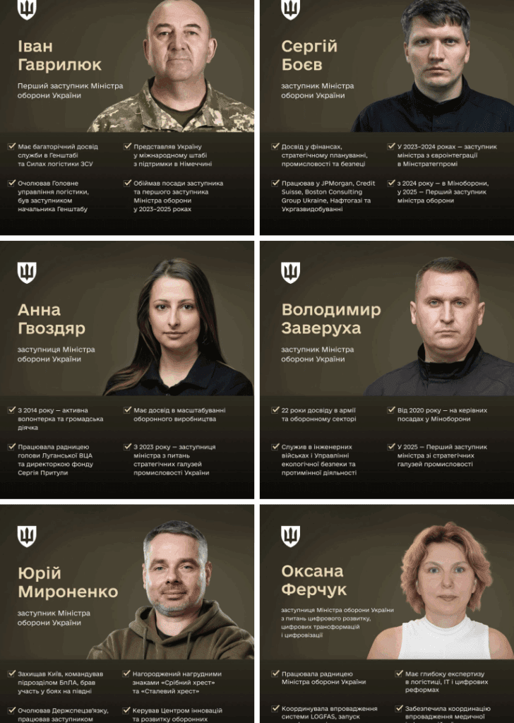 Первым заместителем стал генерал-лейтенант Иван Гаврилюк. Другие заместители — Сергей Боев, Анна Гвоздяр, Владимир Заверуха, Юрий Мироненко и Оксана Ферчук. По информации министерства: