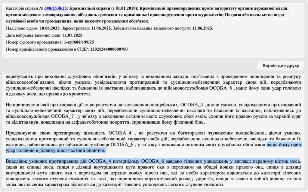 «12 апреля в Шепетовке мужчину остановили для проверки документов, но тот ударил головой военкома и повалил на землю. У него диагностировали перелом костей носа, синяки возле глаз и в лобной области»,— уточнили в судебном реестре.