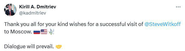 Об этом он написал в X и поблагодарил всех за «добрые пожелания успешного визита Уиткоффа в Москву».