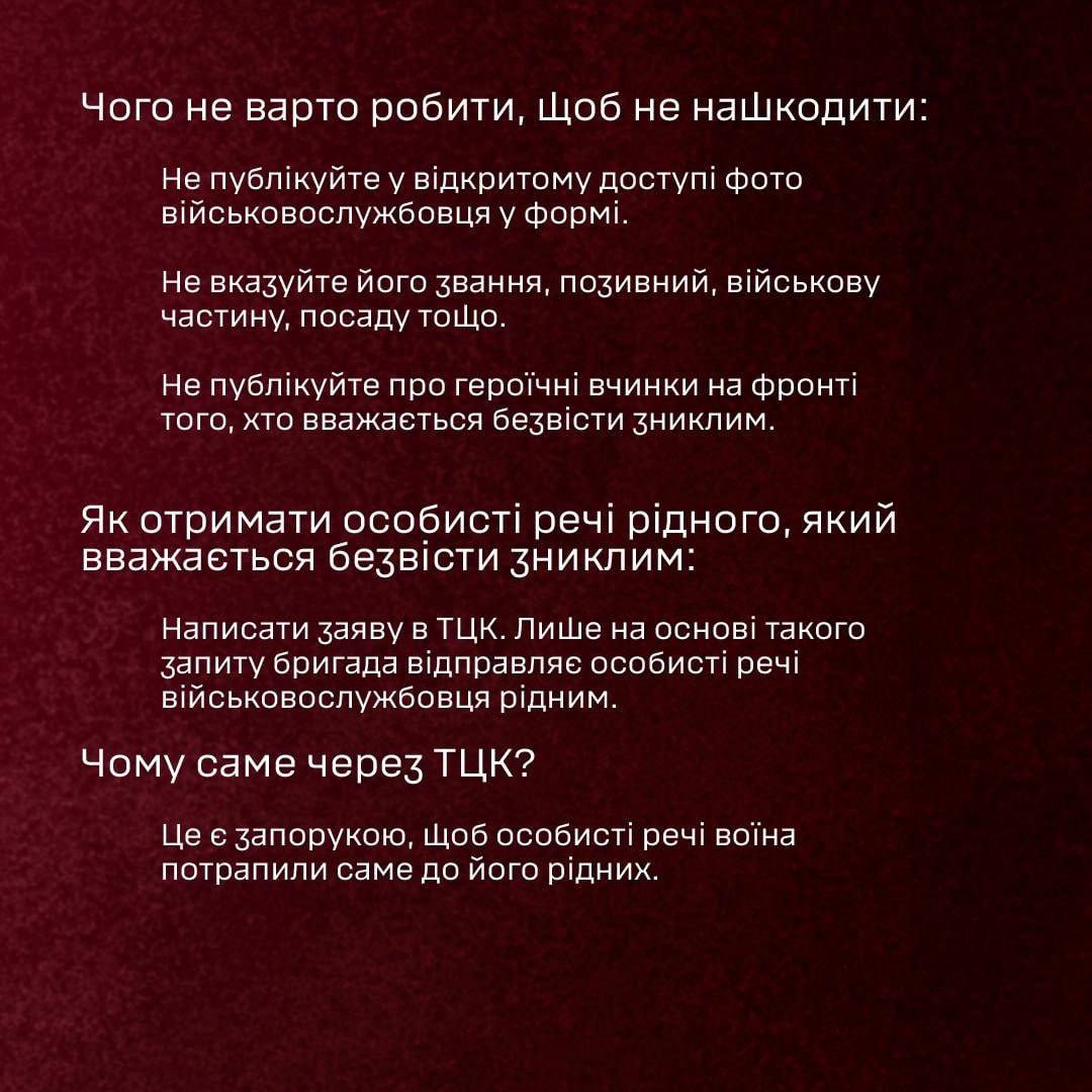 В связи с этим, в социальных сетях бригады была опубликована памятка, содержащая рекомендации для родственников пропавших без вести. Особое внимание уделяется пункту о том, что категорически не рекомендуется публиковать в социальных сетях какую-либо информацию о пропавших близких, особенно о принадлежности к конкретным подразделениям. Официальное объяснение заключается в том, что такие действия могут быть использованы противником.