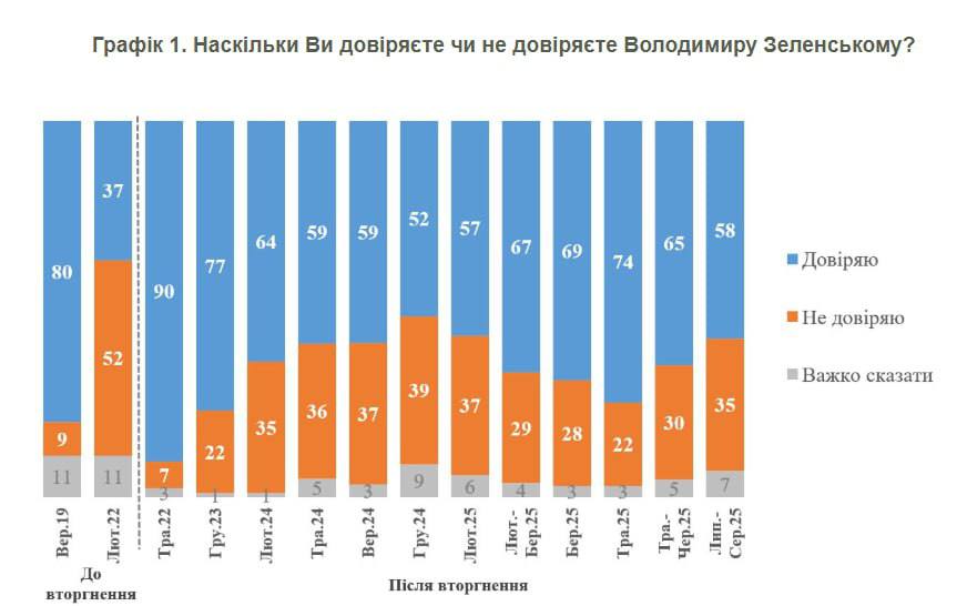 В начале июня этот показатель составлял 65%. В то же время, число украинцев, не доверяющих Зеленскому, выросло с 30% до 35%.