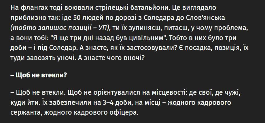 «Идет 50 людей из Соледара до Славянска, покидает позиции, ты их останавливаешь, спрашиваешь, в чем проблема, а они тебе: «я еще три дня назад был гражданским»… Есть посадка, их туда завозят ночью, чтобы не сбежали. Их обеспечили на 3-4 суток. На месте – ни одного кадрового сержанта, ни одного офицера», – рассказал командир.