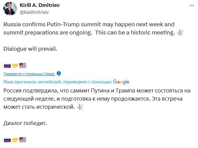 Вероятная встреча Путина и Трампа может стать исторической, заявил глава РФПИ Дмитриев в соцсети Х*