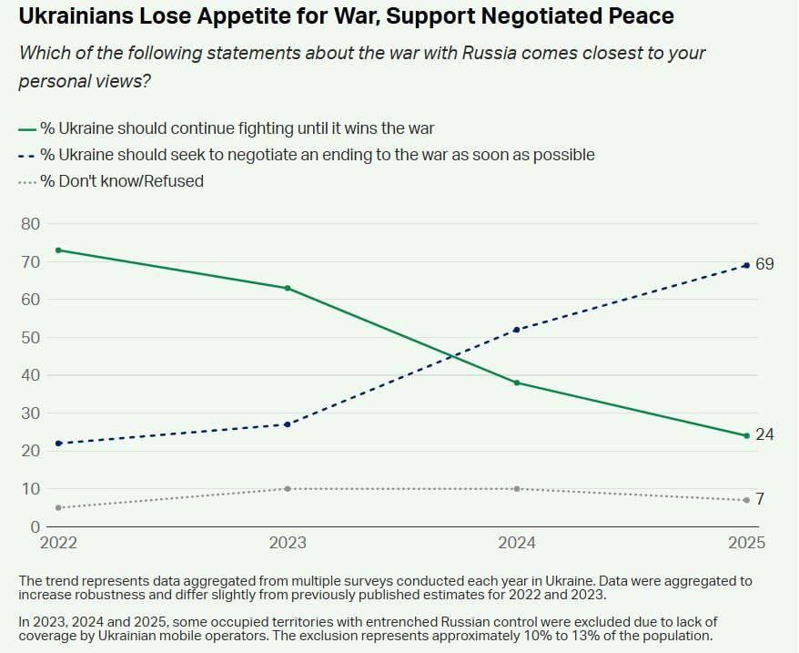 Согласно данным опроса Gallup, уровень поддержки тех, кто выступает за продолжение боевых действий среди украинского населения значительно снизился. В настоящее время только 24% респондентов выражают желание продолжать конфликт.