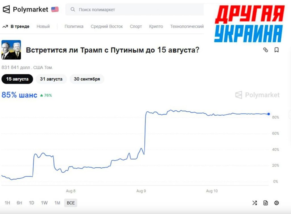 На международной букмекерской платформе Polymarket растут ставки на то, что встреча Путина и Трампа все-таки состоится. Сейчас этот показатель достиг 85%. Это почти втрое больше, чем еще несколько дней назад.