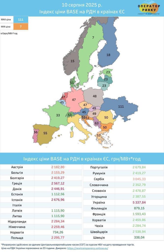 По данным ENTSO-E (европейская сеть системных операторов передачи электроэнергии), 10 августа ценовой индекс базовой нагрузки BASE на рынке «на сутки вперёд» достиг рекордных 5337,84 грн/МВт*ч (10246 руб).