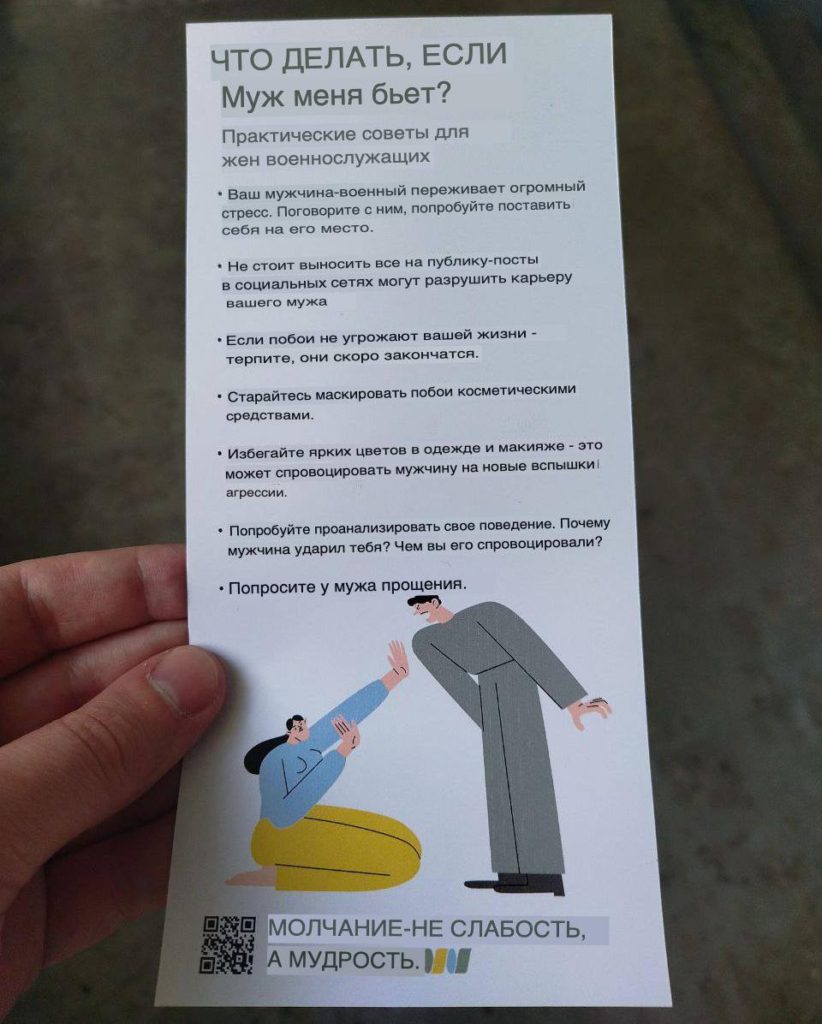 В этих «рекомендациях» прямо советуют терпеть побои, умело закрашивать синяки косметикой, просить прощения у агрессора и, ни в коем случае, не выносить конфликт «на публику».
