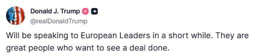 «Скоро поговорю с европейскими лидерами. Они замечательные люди, которые хотят заключить сделку», — написал Трамп в соцсетях.