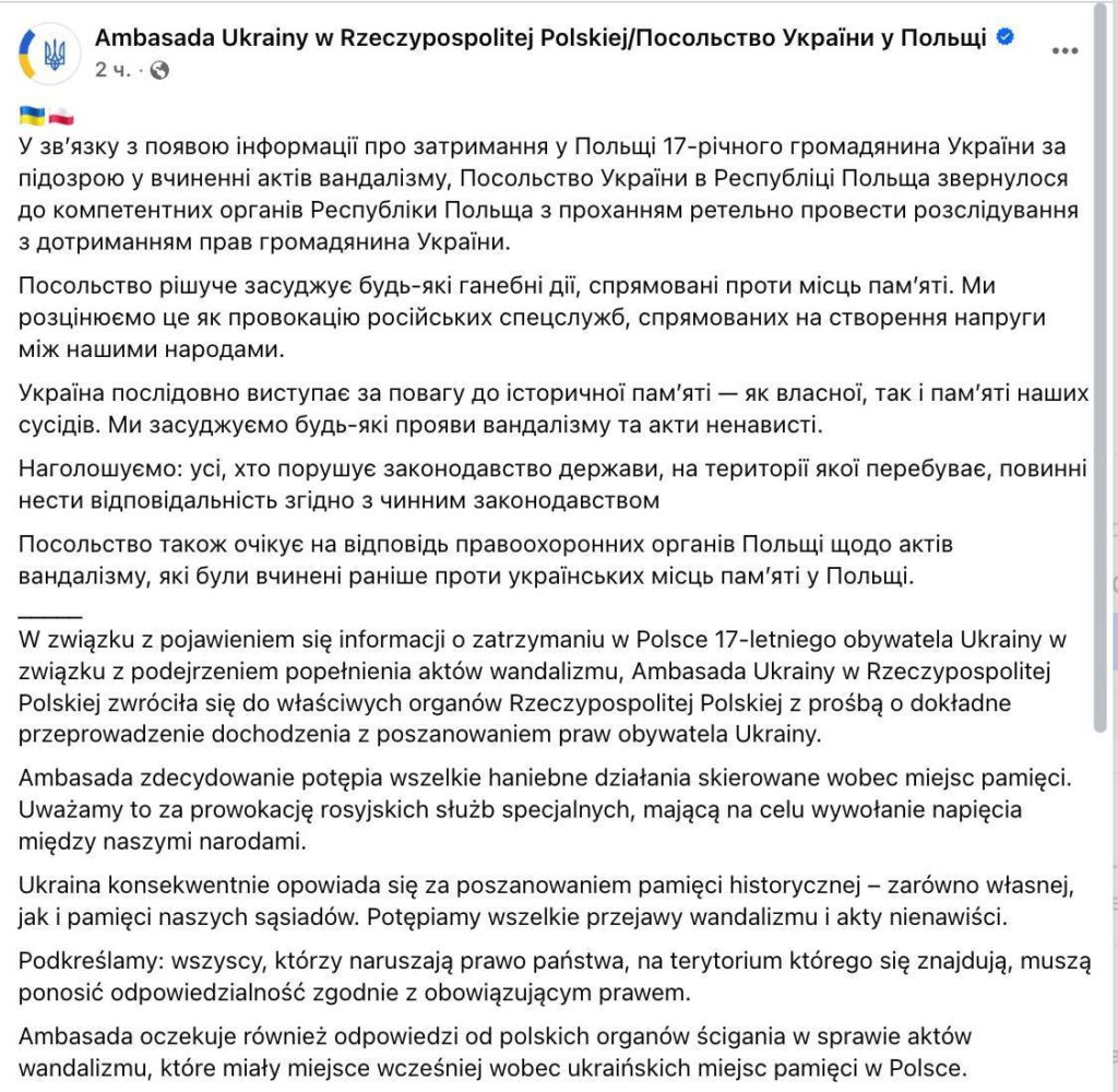 «Посольство решительно осуждает любые позорные действия, направленные против мест памяти. Мы расцениваем это как провокацию российских спецслужб, направленную на создание напряжения между нашими народами», – заявило посольство Украины в Польше.