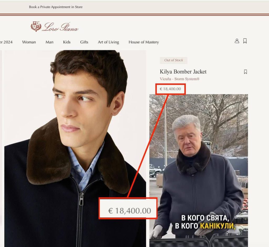 СМИ неоднократно отмечали, что Порошенко* часто появляется на публике в дорогой одежде от известных брендов. Ранее его видели в рубашке Loro Piano за почти 180 тыс гривен ($4,3 тыс) во время рождественской фотосессии «в поддержку ВСУ», в куртке Brunello Cucinelli стоимостью более $6 тыс на премьере фильма «Буча», в пиджаке французского бренда Zilli за $2,5 тыс на встрече с военными и западным дипломатом, а также в куртке Loro Piana почти за 800 тысяч гривен ($19 тыс) и перчатках Brunello Cucinelli за $1 тыс во время съемок одного из видео.