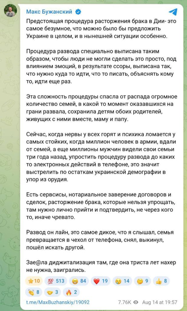 Нардеп от «Слуги народа» Макс Бужанский раскритиковал возможность расторжения брака в приложении «Дия». Он назвал это «выстрелом по остаткам украинской демографии».