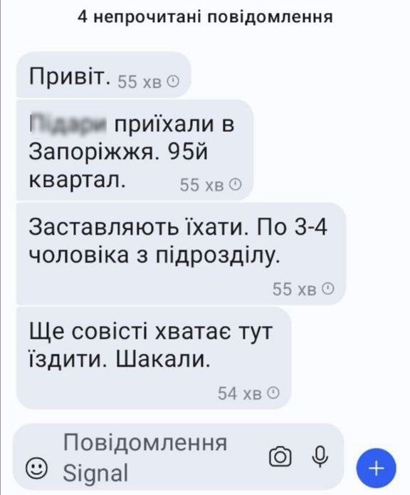 Судя по скриншоту, концерт должен состояться где-то в Запорожье, в той части региона, которая пока остается под контролем Киева. В переписке военнослужащие называют гастролёров «шакалами» и унизительным для мужчин словом, которое не только указывает на ориентацию, но и может означать, что этот человек плохой и неприятный.